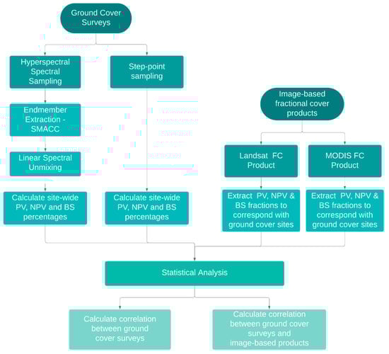 Currently, in situ validation data collected using the Muir et al. [] method is used to assess the accuracy of both the MODIS and Landsat products. Meyer and Okin [] found that the in situ spectral measurements they collected could be used to validate fractional ground cover mapping developed from MODIS imagery over Botswana, but this has not been tested across other environments. To meet our objectives, we therefore completed ground cover surveys before inspecting how our in situ measurements would compare with the MODIS and Landsat products. Figure 1 provides an overview of the methods used in this study.
