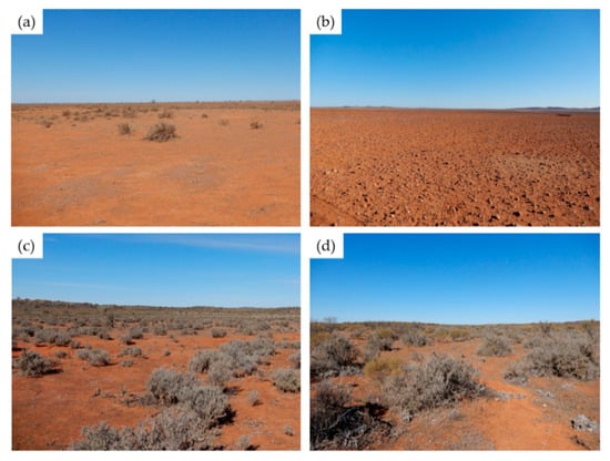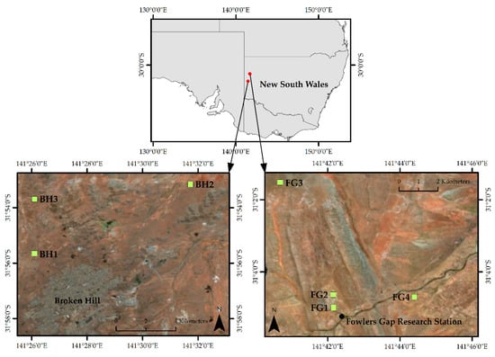The study was conducted in New South Wales (NSW), Australia within the arid zone (Figure 2). Sites FG1–FG4 (Figure 3a,b) were situated at Fowlers Gap Arid Research Station, 110 km north of Broken Hill, NSW, while sites BH1–BH3 (Figure 3c,d) were located surrounding the City of Broken Hill. The climate for both regions is hot and persistently dry []. Fowlers Gap has a mean annual rainfall of 240 mm, a mean annual minimum temperature of 13 °C, and a mean annual maximum temperature of 26.9 °C []. The vegetation at Fowlers Gap comprises low open chenopodiaceous shrublands, some low open Acacia and Casuarina woodland as well as grasslands on the plains Mabbutt et al. []. Broken Hill has a mean annual rainfall of 250 mm with a mean annual minimum temperature of 11.8 °C and a mean annual maximum temperature of 24.7 °C []. The vegetation around Broken Hill is also composed of chenopod shrublands that includes saltbush and bluebush communities as well as Mulga (Acacia aneura) [].