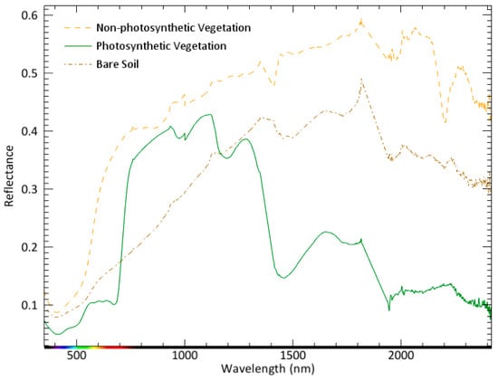 Example of image-derived endmembers for non-photosynthetic vegetation, photosynthetic vegetation, and bare soil.
