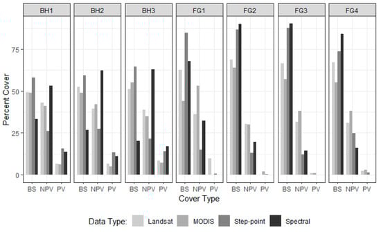 The field-based FC estimates were compared to two Australian image-derived FC products based on MODIS [] and Landsat imagery []. The MODIS FC product was initially developed for monitoring the tropical savanna region of the Northern Territory, Australia [] and was later applied across the continent by the Commonwealth Scientific and Industrial Research Organisation (CSIRO) []. This product uses MODIS imagery and describes the proportion of PV, NPV, and BS Australia-wide. The Landsat product was developed by the Joint Remote Sensing Research Program (JRSRP) also as a national FC product utilising the Landsat archive. Initially developed for rangeland monitoring in Queensland, Australia, the product is now being implemented nationally by Geoscience Australia [,]. Key differences between the two products include their spatial and temporal resolutions. The MODIS product has a moderate resolution of 500 m while the Landsat product is at a finer scale of 25 m. The latest version of the MODIS product uses MODIS MC43A4 version 6 imagery, which is a 16-day composition of daily captures from 2000 to 2019 (on-going) []. The Landsat product utilises data from the Landsat archive from 1986 to the present. Recent versions of the Landsat and MODIS FC products use a similar unmixing process [] that incorporates endmembers of PV, NPV, and BS derived from field spectra and the imagery itself. For this study, the Guerschman and Hill [] version 3.1.0 MODIS product and the Landsat FC25 version 1.5 were used []. The MODIS and Landsat FC products were acquired for dates that corresponded with the collection of in situ ground cover measurements. The Landsat FC image is based on a single date (17 August 2018) while the MODIS FC product is developed from a 16-day composite of imagery collected from the 13 to 28 August 2018. The PV, NPV, and BS values for each of the seven sites were extracted from a single pixel for the MODIS product while an average of 400 Landsat pixels across the same 500 × 500 m area were calculated. These extracted values were then compared to both the step-point and the spectral PV, NPV, and BS fractions.