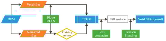 In this work, the voids in DEM data were filled using the proposed terrain texture generation model (TTGM) using the framework of a deep convolutional generative adversarial network. The auxiliary information contained in the global DEM tiles over a rugged topography was incorporated into the deep neural network to simulate the terrain features. The void data and the generated fill surface were then merged, and the neighboring information bordering the voids was used as a constraint. The workflow of the void filling method is given in Figure 1.