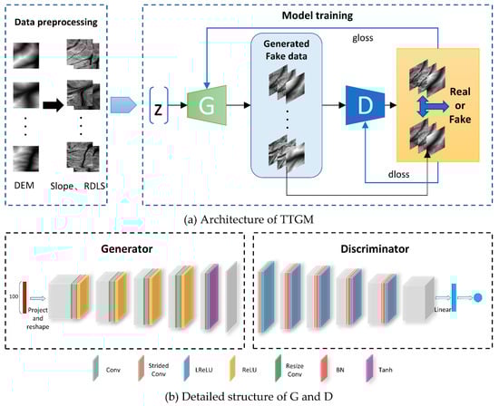 The proposed TTGM was constructed on the basis of DCGAN with a symmetrically structured generator and discriminator. The visualization of the detailed structure is displayed in Figure 2b. A 100-dimension vector z, which is sampled from a Gaussian distribution, is the input of the generator. All sample data generated by the generator and the data to be input into the discriminator have three channels, which correspond to the DEM, slope, and RDLS. The last convolution layer in the discriminator is flattened and fed into a single output.