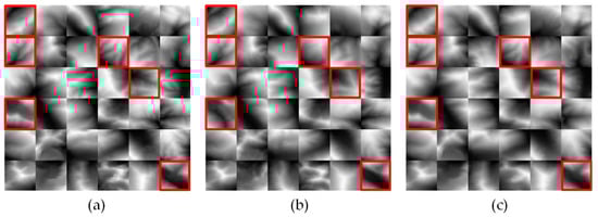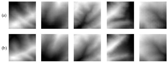 Mini-batches of the original DEM and the data generated by TTGM-DSR and TTGM-D are displayed in Figure 17 for visual comparison. The generated DEM data are generally similar to the original data. The apparent differences between the results obtained by the two models can be observed in the red rectangular regions. It can be seen that TTGM-D generated some false terrain textures that are quite different from the original DEM data, while the terrain structural patterns resulting from TTGM-DSR are similar to those in the original DEM data as a whole. The qualitative and quantitative results prove that the addition of auxiliary data has a certain enhancement effect on the ability of the model to learn the terrain textures in DEM data.