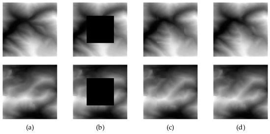 Given the varying sizes and shapes of the real data voids, the TTGMs were trained with two sizes of input patches (64 × 64 and 128 × 128); the two models are designated TTGM64 and TTGM128. The two models were applied to randomly selected void data patches of two sizes, 150 of each, and the quantitative results are given in Table 1. The visual results of 16 void-filled data patches are displayed in Figure 8. The original DEM data were used as a reference for accuracy evaluation. The quantitative accuracy of TTGM128 is relatively low because there is generally a larger number of missing pixels in the 128 × 128 data. Both models obtained results with high SSIM values, which indicate that the proposed method is capable of generating natural terrain textures. It can be clearly seen that the generated data (in Figure 8c) are highly similar to the original DEM when the void area is relatively small. Even if the void area accounts for more than 50%, the generated data remain highly consistent with the original DEM in terms of the texture structural patterns. The seamless void-filled results show good visual fidelity, as illustrated in Figure 8d.