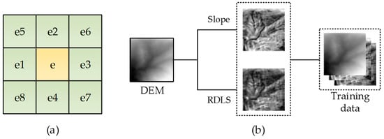 where and are the maximum and minimum elevation values in the window, respectively. In addition to the DEM patches, the slope and RDLS were also incorporated to construct the training dataset, which is displayed in Figure 6b.
