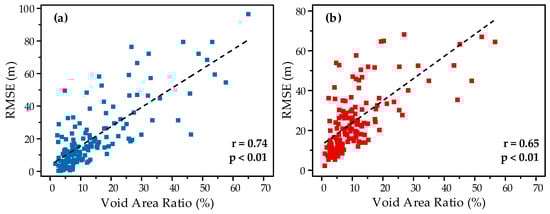 Correlation scatterplot of RMSEs and the void area ratio. (a) The plot of TTGM64; (b) the plot of TTGM128.