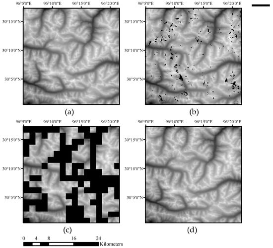Digital elevation models (DEMs) are important sources of fundamental geospatial data [1,2] and play a significant role in research fields as diverse as water resources and hydrology [3], agriculture [4], geomorphology [5,6], and glaciology [7]. With the rapid development of remote sensing and photogrammetry technologies, the ability to obtain DEM data has been increasingly enhanced [8,9]. Currently, there are abundant public DEM data products covering most of the world’s land areas, and they provide important topographical information for geoscience-related research [10,11,12,13,14]. However, the quality of DEM data is inevitably affected by the limitations of observation technology and terrain conditions involved in the process of DEM acquisition and production. The quality of commonly used DEM products, such as Shuttle Radar Topography Mission (SRTM) [12], Advanced Spaceborne Thermal Emission and Reflectance Radiometer Global Digital Elevation Model (ASTER GDEM) [14], and TerraSAR-X add-on for Digital Elevation Measurement (TanDEM-X) [15] are affected by a large number of voids [16], which need to be reconstructed before the DEMs are used in further applications. Therefore, it is of great significance to fill the voids in DEM to meet the high demands of various geoscience applied research.