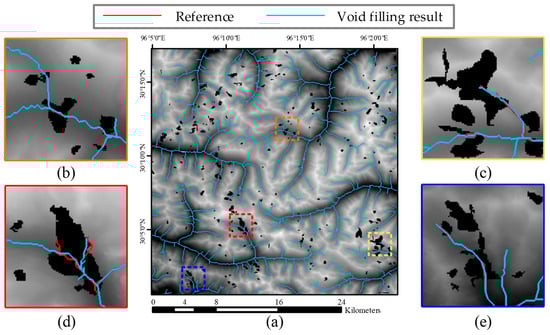 In this regard, we compared the river networks extracted from the original DEM data and the void filling results. In Figure 11, the drainage lines extracted from the void filling result are displayed in blue, while the red lines denote the reference river network extracted from the original DEM. The extracted river networks are superimposed and displayed. The void pixels are displayed in black. Figure 11a shows that the two river networks are highly consistent in the position of the flow and branches. In order to better compare the extraction results, we provide zoomed views of four subregions in Figure 11b–e. Overall, the void filling results obtained show extracted hydrological features that are continuous and topologically consistent with the reference river network.