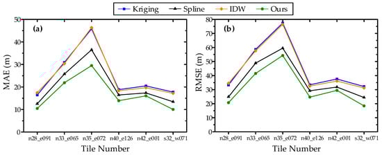 The voids in DEM data can be partly filled and reconstructed by combining the multi-source elevation information [47,48]. However, obtaining a reliable information source for significantly rugged topography is difficult. For those areas, interpolation algorithms are commonly used to fill the voids. In this section, we compare our method with three classical algorithms, namely, kriging, spline, and IDW.