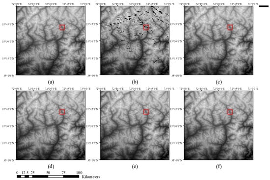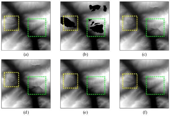 Zoomed displays of the red rectangular region in Figure 14. (a) The original DEM data, (b) simulated test data; (c–f) the void filling results of Kriging, Spline, IDW, and the proposed method.
