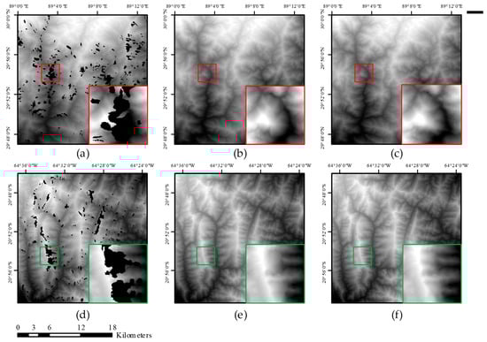 Real-data experiments. (a)–(c) are the partial results of data tile N29E089, and (d)–(f) are the results of data tile S21W065. From left to right: void data, void filling result from the spline method, and void filling result from our proposed method.