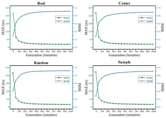 As indicated in Figure 18, the curves in the four plots all have similar trends, and all of them achieve the convergent status by the end of the generation. If we take the result in the first plot as an example, it is obvious that the first 50 iterations experience a sharp decrease in the value of MAE. However, after that, the value of MAE decreases slowly and levels off at around 20 m. The trend of the blue curve is the opposite of that of the green curve, and the value of SSIM reaches around 0.9 in the final generation.