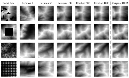 A comprehensible visualization of the evolution of the generated DEM patches regarding visual fidelity is shown in Figure 19. We enumerated the generated data by iterations (1, 50, 100, 500, and 1000) between the original DEM data and the input void data as an example. It is obvious that the data generated by the generator are cluttered at the very beginning. After 50 iterations, coarse terrain structural patterns can be seen in the generated results. Then, as the number of iterations increases, the loss function constrains the generation of images during backpropagation, while terrain details such as peaks and valleys begin to appear during the evolution. By iteration 1000, high-quality generated DEM data, which are almost visually indistinguishable from the original DEM data, are obtained.