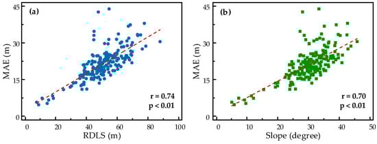 The relationships between (a) RDLS and MAE, (b) slope and MAE.