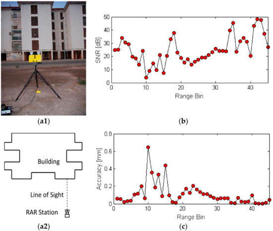 (a1) RAR device and building; (a2) Plan view of the acquisition point; (b) Signal-to-noise-ratio (SNR); (c) accuracy plots of the RAR signals. Rbin 35 leads to the time series with the best quality data, due to high SNR (45 dB) and great accuracy (0.006 mm).