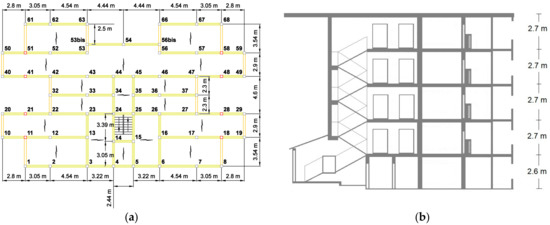 Surveyed building: (a) Floor plan with the frame distribution. Arrows indicate the orientation of unidirectional slabs; (b) Cross-section of a module.