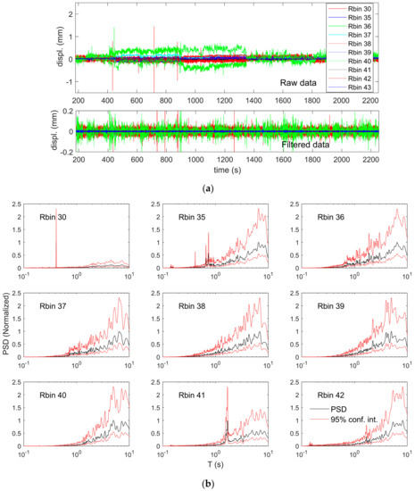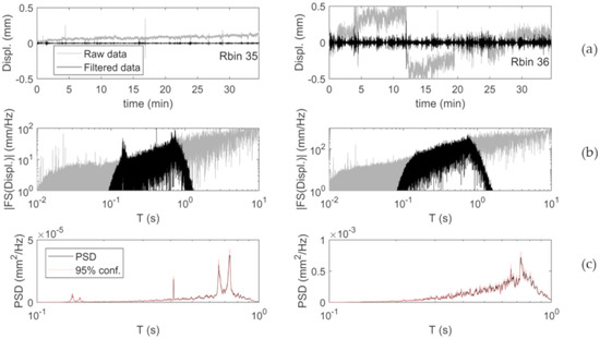 The raw data were collected at a sampling rate of 144 Hz and the duration of the signal was 35 minutes. For the Welch method, Hamming windows with 95% overlap were used and the length of the windows was 2.2 minutes, so that the resolution in the frequency domain was higher than 0.01 Hz (Δf = 0.0077Hz). For clarity, in Figure 5b, PSDs were normalized to the maximum value so that mean PSD values range between 0 and 1. Black lines are the mean values and red dashed lines correspond to 95% confidence upper and lower bounds. As pointed out above, no clear frequencies can be seen in the 0.1–1.0 period range with the only exception of Rbins 35 and 36. Rbins 41, 42, and 43, which also show good enough SNR and accuracy in Figure 2, probably are contaminated by other vibrating objects hiding the actual structural vibration. Thus, only Rbins 35 and 36 are used in the following analysis. Figure 6 shows the raw and filtered displacement time series in the time and frequency domains. In this case, the band-pass of the filter is 1.25–10.0Hz. The corresponding PSD are also shown in the lowest subplots.