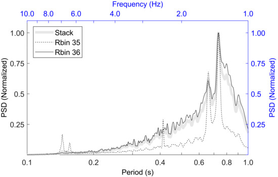 In order to improve the quality of the analysis, Rbins 35 and 36 were stacked in the time domain. It is well known that staking enhances coherent components and abates other incoherent components. The stacking technique is commonly used in seismology. Stacking seismic data is oriented to enhance coherent signals and soften random signals, that is, noise. The SNR of the output trace should be higher than that of a single trace. Figure 7 shows the normalized PSDs of Rbins 35, 36 and the one of the stacked signals. Clear peaks are found at periods of 0.66 s and 0.73 s (frequencies of 1.51 Hz and 1.36 Hz). Other peaks, for example those included in the interval 0.1–0.2 s. and present only in Rbin 35, are smoothed when Rbin 35 and Rbin 36 are stacked. These two peaks are assumed to correspond to the structural free vibration of the building.