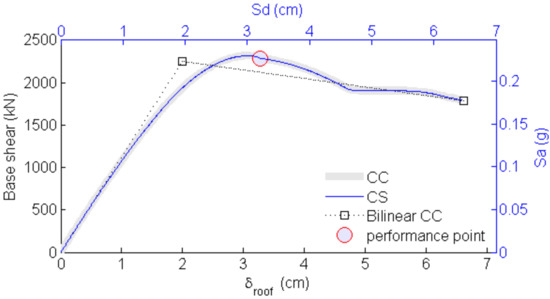 Table 4 displays the characteristic points of these two curves. That is, the yielding and ultimate capacity points and the maximum values of the shear forces, in the capacity curve, and the corresponding maximum values of the spectral acceleration, Sa, in the capacity spectrum.