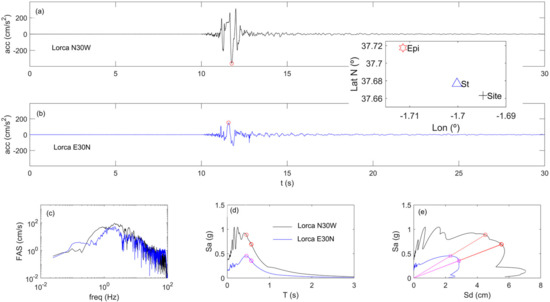 Horizontal accelerograms recorded at the Lorca accelerometric station. (a) N30W accelerogram; red circle corresponds to the peak ground acceleration, (b) E30N accelerogram. Red circle corresponds to peak ground acceleration. (c) Fourier amplitude spectra. (d) 5% damped response spectra. Red and pink circles correspond to the periods of the building (see Table 3). (e) 5% damped response spectra in Sd-Sa format; red circles and pink squares correspond to the periods of the building. The locations of the site, accelerometric station and epicenter are also sketched.