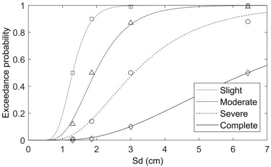 For a given damage state, the corresponding fragility curve defines the probability of reaching or exceeding this damage state as a function of a parameter representative of the severity of the seismic action [42]. This parameter, in our case, is the spectral displacement, Sd. Usually, fragility curves are described by lognormal cumulative functions and, this way, they are fully defined by means of the mean value, μ, and the standard deviation, β, of the lognormal function. In the framework of the European project Risk-UE, a simplified procedure, allowing setting up fragility curves starting from the bilinear form of the capacity spectrum, was proposed [43,44]. Four non-null damage states are considered. Namely 1. Slight, 2. Moderate, 3. Severe and 4. Complete. Mean values are determined by means of the following equation: