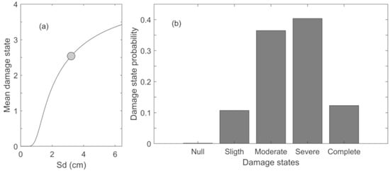 The index i = 0 corresponds to the Null or No-damage state. The indices i ∈ {1, 2, 3, 4} correspond respectively to Slight, Moderate, Severe and Complete damage states. Notably, MDS(Sd) in Equation (4) takes values between 0 and 4. MDS(Sd) = 0 means that the probability of the no-damage state is 1 and MDS(Sd) = 4 means that the probability of Complete damage state is 1. Figure 11 shows the mean damage state curve corresponding to the fragility curves of Figure 10. The spectral displacement of the performance point, Sd = 3.2 cm, is also plotted in Figure 11; the corresponding mean damage grade is 2.54 and the probabilities of the damage states 0. Null, 1. Slight, 2. Moderate, 3. Severe and 4. Complete, are 0.11, 0.36, 0.41, and 0.12, respectively. This damage distribution is also depicted in Figure 11. It means that 77% of this kind of buildings exposed to the seismic action of the Lorca 2011 earthquake would suffer moderate or severe damage and 12% would be close to collapse.