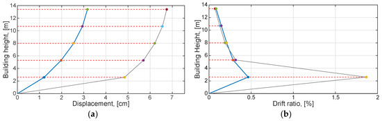 The damage observed in the building clearly suggested a first floor soft-story effect as an important contributor to damage. Thus, this effect has been analyzed by means of the study of the inter-story drifts. Figure 12 shows the displacements (Figure 12a) and inter-story drift ratios (Figure 12b) at the performance point (blue line) and at the ultimate capacity point (black line). Table 5 summarizes the obtained inter-story displacements and drifts ratios.