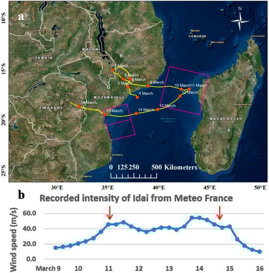 (a) The track of Tropical Cyclone (TC) Idai, and the pink boxes show the locations of Sentinel-1 scenes; (b) recorded intensity of Idai by Meteo France from 9 March 2019 to 16 March 2019. The red arrows point to the time when the synthetic aperture radar (SAR) images were acquired.