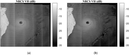 A refined Lee filtering was first applied to the SAR image to remove high-frequency noise using the SNAP software. The cross-pol SAR image was then used to determine the eye center of the TC Idai using the threshold of the measured NRCSs and the maximum gradients along different radial directions, following the work of Zhou et al. [42] and Xu et al. [43].