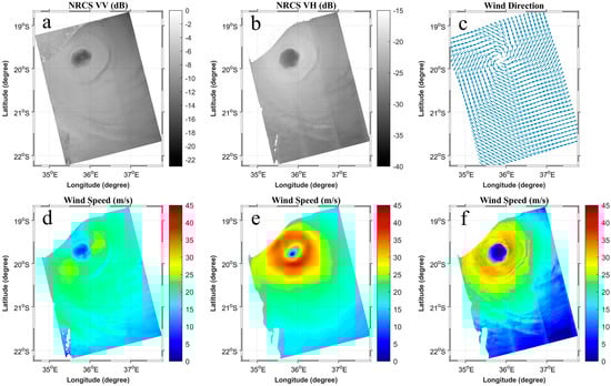 TC Idai captured by Sentinel-1 dual-polarization SAR image at 16:04 UTC on 14 March 2019 showing (a) VV polarization and (b) VH polarization, both with the NRCS (dB) given by the grey-scale values; (c) ECMWF wind directions recorded in the S-1 Level-2 OCN product; (d) wind speeds based on the ECMWF wind directions and the CMOD-IFR2 model; (e) wind speeds from ECMWF; and (f) wind speeds retrieved by the C-3PO model, all with the color bar denoting the wind speeds (m/s).