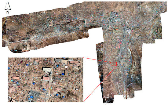 On April 14 2010, Yushu County in Qinghai Province, China was hit by a 7.1-magnitude earthquake [25]. In this study, the aerial images with 0.1-m resolution on 16 April 2010 in Jiegu Town, the worst-hit area in the earthquake, was obtained. The data overview is shown in Figure 1, and the relevant parameters of the data are shown in Table 1.