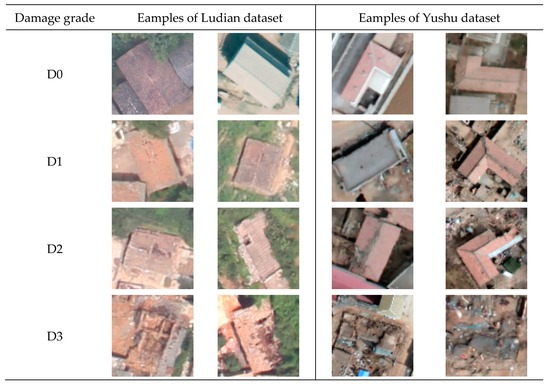 The standard that we used to classify the damage degree is similar to EMS-98 [8], but with fewer levels. The damage degree D0 in this paper corresponds to G0-2 in EMS-98. D1 corresponds to G3 in EMS-98, and the rest can be done in the same manner. The standard can be found in Table 2, and some samples of each damage level can found in Figure 3. We got about 13,780 individual buildings from remote sensing data of Ludian and 3501 buildings from Yushu by visual interpretation and classified them into four damage degrees building by building. When we labeled these samples, a few ground photos were used as a reference. These photos can help us better understand the actual damage to the buildings and the damage grade.
