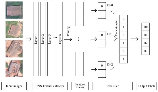 As described in Section 2, in this study, buildings damaged by earthquakes can be classified into four damage degrees: D0, D1, D2, and D3. Based on this ordinal relationship, an OR-based building damage degree classifier model is proposed. For verification and comparison, the building assessment problem can be turned into a multiclass classification problem that adopts a Softmax classifier in a straightforward manner.