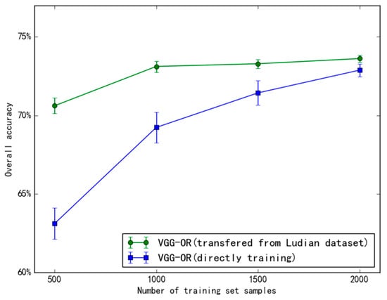 Figure 5 shows the impact of the number of training set samples on the overall accuracy, and the error bar represents the SD value. The model that was transfered from the Ludian dataset is more accurate and more stable.