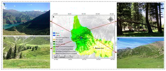 Field photos at the Bogda. (a) Land cover types in 2015. (b,c) Montane coniferous forests. (d) Co-occurrence region of montane coniferous forests and alpine meadows. (e) Alpine meadows.
