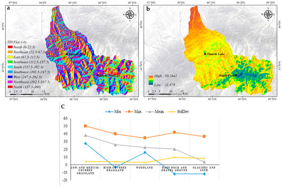 The vegetation types that grow on the southern-facing and northern-facing slope of the Bogda have significant differences. The montane coniferous forests mainly grow on the northern-facing slope, and the aspect distribution map is illustrated in Figure 4a (extracted from SRTM DEM data). Furthermore, the LST was retrieved by the mono-window algorithm (Figure 4b). Based on land cover types (Figure 2a), the minimums, maximums, means, and standard deviations of the LST for different land cover types were compared (Figure 4c). In the summer, the area with the highest LST (mean approximately 40 °C) was distributed in the low-covered and medium-covered grasslands corresponding to the temperate desert and the desert grassland, respectively. The area with lower LST (mean approximately −12 °C) was distributed in the snow and glaciers.