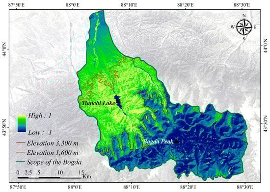 The Bogda is a typical mountain ecosystem. The radiation received by sensors is the result of complex interactions between the sun, the atmosphere, and the Earth’s surface. Therefore, in the mountainous areas, the radiation on different aspects has significant differences, which ensures the characteristics are reflected by remotely-sensed images different from the real features []. The influence of topography on the surface reflectance retrieval cannot be neglected []. This study performed topography corrections (SCS+C), atmospheric corrections, and cropping of Landsat OLI data (excluding panchromatic bands). The normalized difference vegetation index (NDVI) is a vegetation index, which is widely used to monitor vegetation growth and cover [,]. Then, NDVI was computed by the band 4(Red) and band 5(Near-Infrared, NIR) based on the processed image data, as shown in Formula (1).