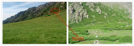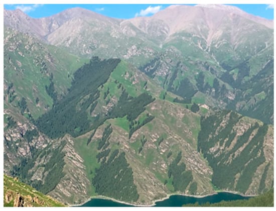 The Bogda has a typical altitudinal natural zone, covering almost all the natural landscape types and ecosystems in central Asia. With the increase of the elevation, the altitudinal natural zones exhibited six types: temperate desert (800–1100 m), montane steppes (1100–1650 m), montane coniferous forests (1650–2700 m), alpine meadows (2700–3300 m), alpine cushion vegetation (3300–3700 m), and ice and snow (>3700 m) []. Within a horizontal distance of 40 km, the elevation rises from 800 m to 5000 m, with six altitudinal natural zones. It is rare that, within such a short horizontal distance, the integrated altitudinal zone is typical as well as representative of the temperate arid zone, which reinforces the global significance of the site in the study of the succession of montane ecosystems. Meanwhile, this area has also been accepted by the United Nations Educational, Scientific and Cultural Organization (UNESCO) as a Man and Biosphere Reserve []. In the study area, montane coniferous forests are dominated by Picea schrenkiana, while alpine meadows are composed of Kobresia capillifoli (Figure 2).
