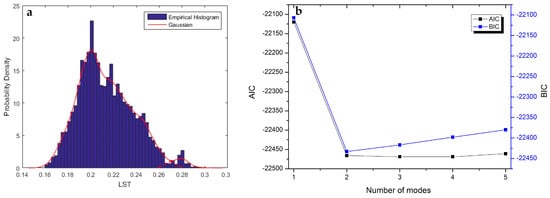 (a) LST probability density distribution. Note that LST values were arcsine transformed. (b) AIC and BIC for the simulations of one to five normal distribution modes.