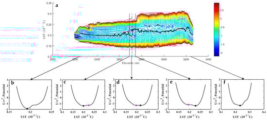 (a) Variation of the states obtained from potential energy analysis for the LST along the elevation gradient. Black and purple dots were both local minimums of potential energy, but black spots had lower potential energy. Between the two black vertical lines (at an elevation of 2690–2744 m) was the area where the two states co-occurred. At the black dotted line (at 2714 m), the low LST state potential energy was greater than the high LST state potential energy, and the system appeared to shift to a high LST state. The contour was the spatial distribution of the potential energy estimation results. (b–f) showed the details for the variation of the states of LST along the elevation gradient.