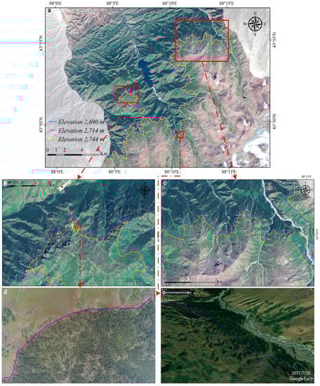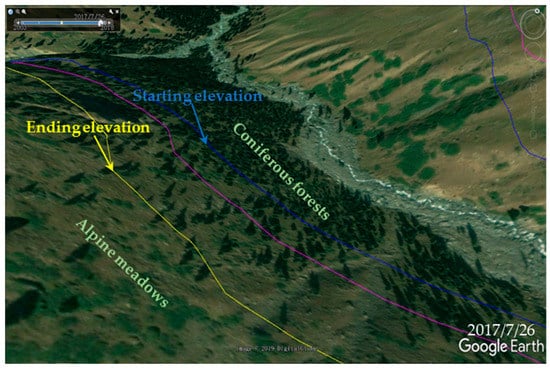 The results showed that the transition’s elevation range was 2690–2744 m, and the demarcation elevation of two states shifting was 2714 m. It was consistent with the research conclusions of the Tianshan altitudinal zones given by other studies [,,]. However, there were probable errors in estimating the key parameters, and this may be unavoidable. Therefore, field validation was conducted at the Bogda on 4–14 July 2018. Along the two sides of the Sangong River, the location information, elevations, and a large number of photos in situ were recorded using unmanned aerial vehicles and high-precision GPS devices (Figure 10b–d). In addition, Sentinel-2 L1C and Google Earth data were used to aid in validating the results (Figure 10a,e).