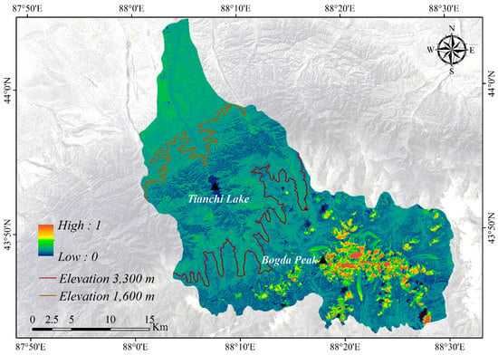 The shifts in land cover types with elevation (altitudinal natural zones) is the outstanding universal value (OUV) of the Bogda [], which is affected by the spatial variability of water resources and heat energy in elevation and aspect. The Bogda is located in the eastern part of the northern Tianshan Mountains, and the northern Tianshan Mountains are in an east-west zonal mountainous system. In this study, except for the aspect analysis, we divided the area of interest into south-facing slope and north-facing slope. In addition, in aspect analysis, the aspect was classified into eight categories: the north (0° ~ 22.5°, 337.5° ~ 360°), northeast (22.5° ~ 67.5°), east (67.5° ~ 112.5°), southeast (112.5° ~ 157.5°), south (157.5° ~ 202.5°), southwest (202.5° ~ 247.5°), west (247.5° ~ 292.5°), and northwest (247.5° ~ 337.5°).