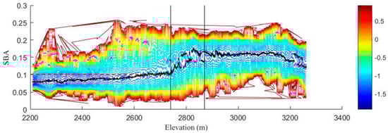 The SBA spatial distribution was shown in Figure 11. The higher SBA values were mainly distributed with glaciers and snow (above the elevation of 3300 m). In the elevation range of 1600 to 3300 m, the SBA’s value of montane coniferous forests was significantly lower than that of meadow steppes. The value of SBA was relatively high in temperate desert regions (below the elevation of 1600 m). The same area of interest as LST covered was selected to analyze the distribution of the potential energy value of the SBA along the elevation gradient (Figure 12).