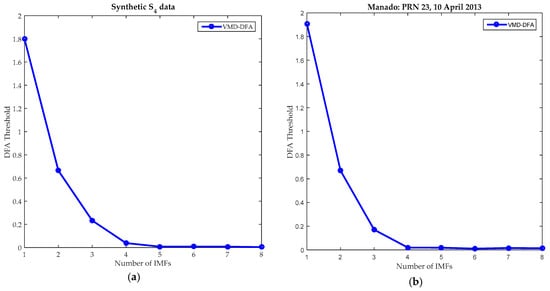 The detection of ionospheric scintillation features from the IMFs, however, is a decision criterion of the binary source. Therefore, MFDFA was chosen as the binary hypothesis technique so that a robust threshold for better identification of noisy IMFs could be established for CEEMD and VMD. At the same time, MFDFA was chosen for its superiority and efficiency as a criterion, shown in Figure 6, when combined with VMD and CEEMD.