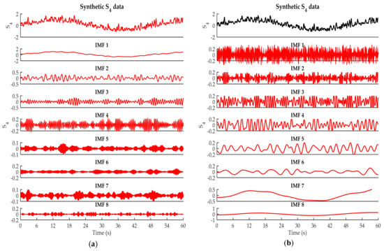 VMD has its own filtering characteristics. Both the synthetic and real signals are decomposed by VMD, which contains a random noise introduced to the signal. VMD makes a clear difference between the scintillated signal (noise) and the constructed signal (noise-free) when compared, as shown in Figure 3a (original scintillated signal) and Figure 4a Panel 2 (IMF 1—noise-free). Fluctuation characteristics of the reconstructed signal are distinct (differentiable) in the time domain. It can be observed from VMD theory in Equation (9) that the quadratic penalty term, α, is in the denominator. Hence, when α increases, the bandwidth of each mode decreases, and then the spectrum becomes smooth, while the filtered and smoothed modal components are discarded as noise.