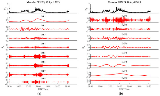 The signal interference was due to ionospheric scintillation, which was as high as 1.3 (from Figure 3b). The VMD and CEEMD methods were applied to the synthetic and the real S4 index signal with PRN 23 (10 April 2013). This was done to estimate and mitigate the effect of scintillation (noise), as shown in Figure 4 and Figure 5, respectively. VMD adaptively breaks the scintillated (synthetic and real) signal into a series of modes with different scales, and thereafter each of the modes (IMFs) are classified by MFDFA.