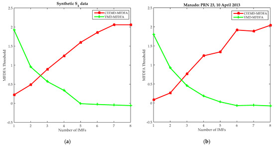 Multifractal detrended fluctuation analysis (MFDFA) threshold for the decomposed IMFs of synthetic and real scintillation data using CEEMD and VMD methods: (a) synthetic scintillation data and (b) Manado station scintillation data.