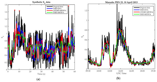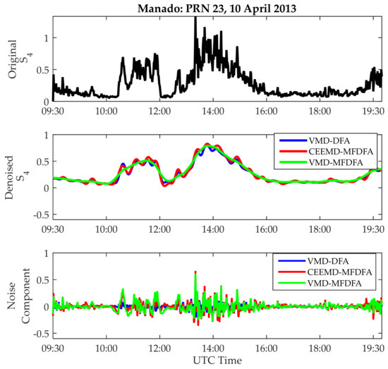 Here, for the estimation and mitigation of ionospheric scintillation effects on a satellite signal, an adaptive time–frequency decomposition technique known as variational mode decomposition (VMD) was proposed. It is a non-recursive method and can adaptively extract the intrinsic modes from any non-linear and non-stationary signals concurrently [18]. In VMD, the Wiener filter estimates the center frequencies and bandwidth for each IMF to address the presence of noise adaptively [17]. It easily detects ionospheric effects and unstable signals [20] and uses an iterative search variational optimal solution to extract each IMF component [21]. The mode-mixing problem and communication influence have been resolved, as VMD effectively filters out noises with large intensity and other interferences simultaneously [22]. Many investigations, such as denoising of various noisy signals, biomedical images, seismic data acquisitions, and geophysical applications have been carried out using VMD [23]. The non-linear properties and complexity of random ionospheric irregularities are determined with this method. Besides, the harmonics in the scintillated GNSS signal are effectively decomposed too. In this paper, VMD in combination with MFDFA was able to estimate, mitigate, and re-acquire GNSS signals under the intensity of ionospheric scintillation effects. The results show that the performance of VMD-MFDFA alleviated the impact of ionospheric scintillation effects on the GNSS signal by choosing a robust threshold for different VMD IMFs to retrieve scintillation-free signals better than CEEMD in combination with the MFDFA method. A comparative analysis of the results obtained from the synthetic and real (at Manado station, Indonesia) S4 index data was conducted through which the efficiency and reliability of the proposed method of denoising were verified. Statistical tools, such as standard deviation (STD) and root mean square error (RMSE), were employed to accurately prove the effectiveness of VMD-MFDFA over the GNSS signal.
