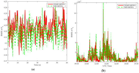 In addition, to better analyze and evaluate the performance of VMD-MFDFA and compared with the CEEMD-MFDFA method, the root mean square error (RMSE) was used as a measure, and the results are clearly depicted in Figure 9a,b for synthetic and real data, respectively.