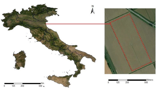 This study was carried out on a 22-ha field located in a typical valley area (at Porto Felloni Co.) in Ferrara, North Italy (Figure 1). The study field lies within the Mediterranean climatic zone and the total rainfall during the corn growing season was 266 mm on average. The soil texture is silt loam and the study field has been irrigated by a center pivot irrigation system and cultivated with corn for two decades, with the exception of 2015, when it was cultivated with wheat. This work focused on three years of corn cultivation from 2016 to 2018. The corn planting dates were 30 March 2016, 22 March 2017 and 11 April 2018 for the study field and harvest was done at a crop age of 160 days on average. The company cultivated the same corn seed variety (Pioneer P1916) during the study period with 75 cm of row spaces and 16 cm between seeds, on average. Additionally, they used a variable rate of nitrogen application with an average urea application (nitrogen 46%) of 344 kg/ha in 2016 and 2017 and 367 kg/ha in 2018. The prescription map of applied nitrogen was the same for the 2016 and 2017 seasons and modified for the 2018 season.
